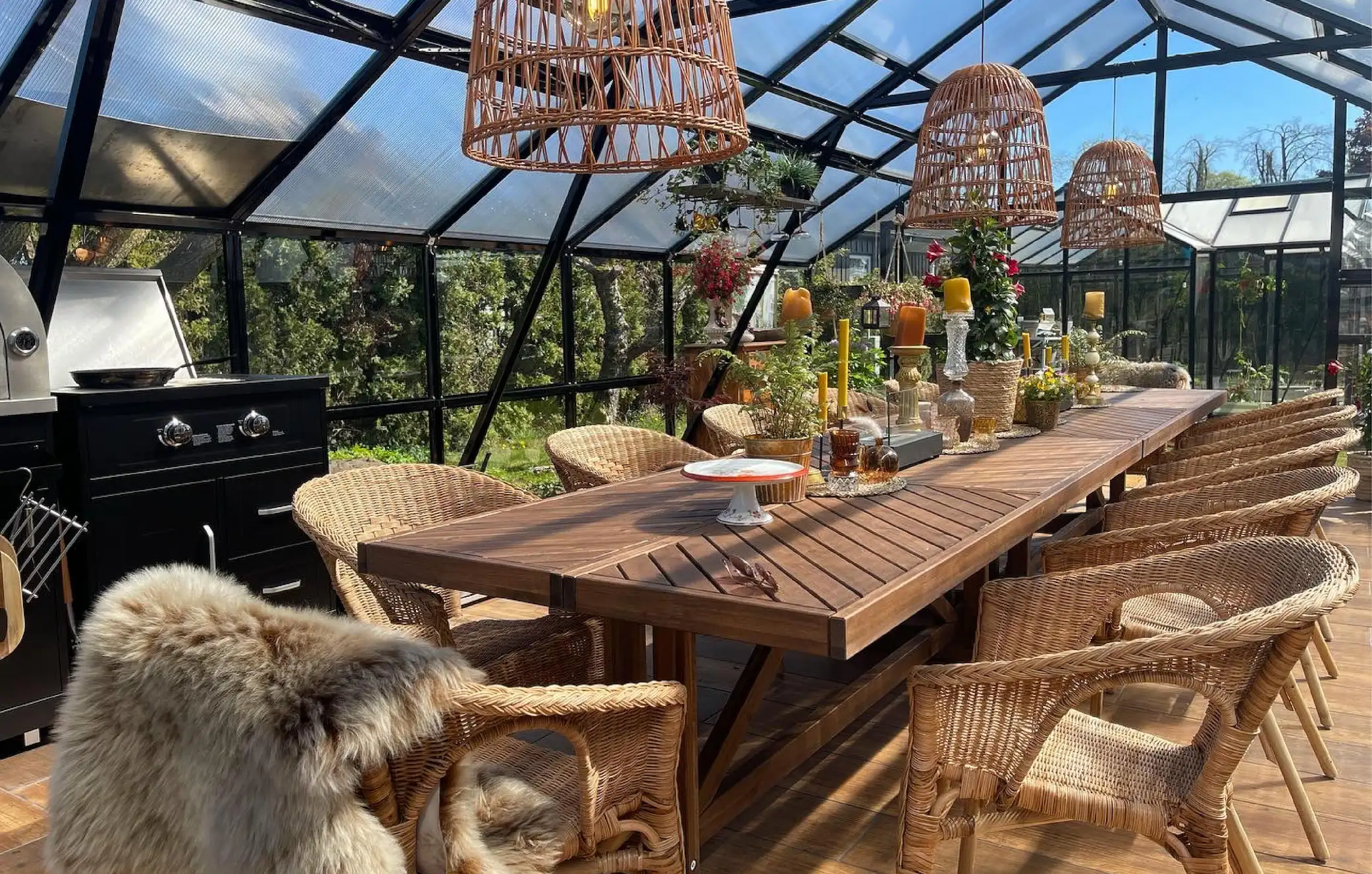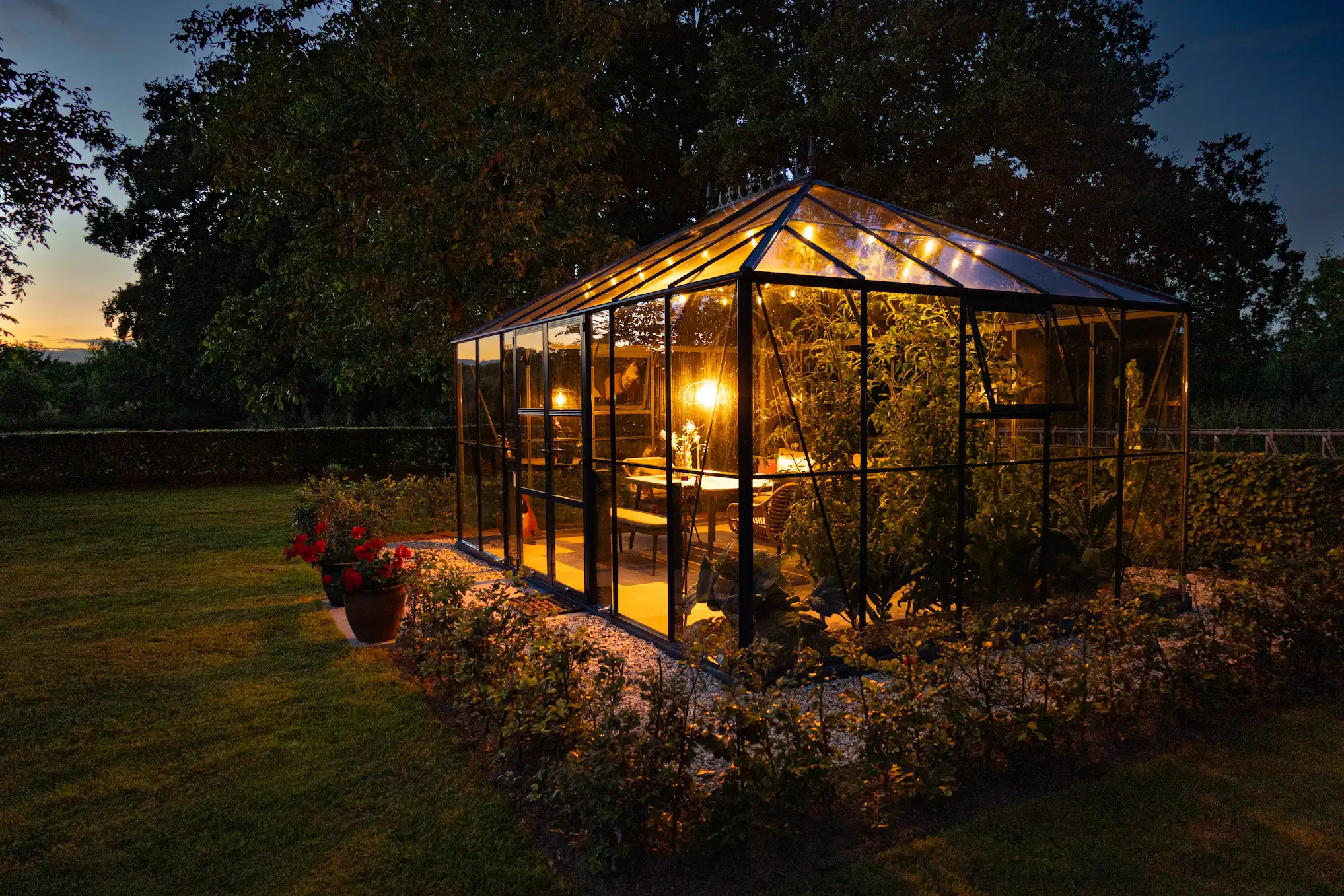 Light plays a big role in how a space feels. During the day, natural light fills the orangery through the glass walls and roof. In the evening, you can add softer lighting to create a warm atmosphere. Think of subtle outdoor lighting, lanterns or a simple hanging lamp above a table. This makes the space feel inviting, even after the sun goes down.