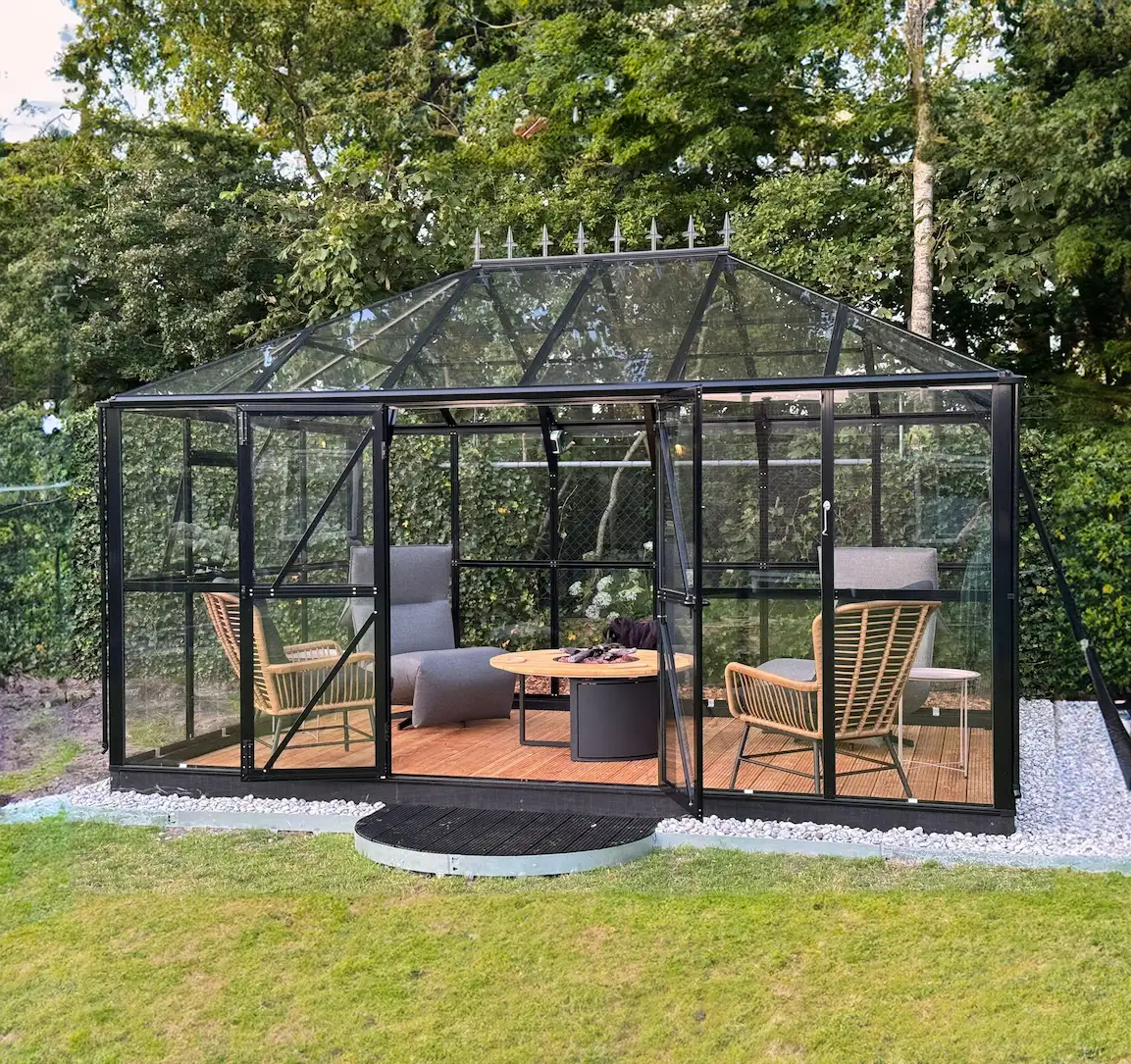Gardenmeister orangeries are designed with a black aluminium frame and large glass panels, creating a modern and timeless look. Whether you choose a classic design or a more contemporary model, it always adds character to your garden.