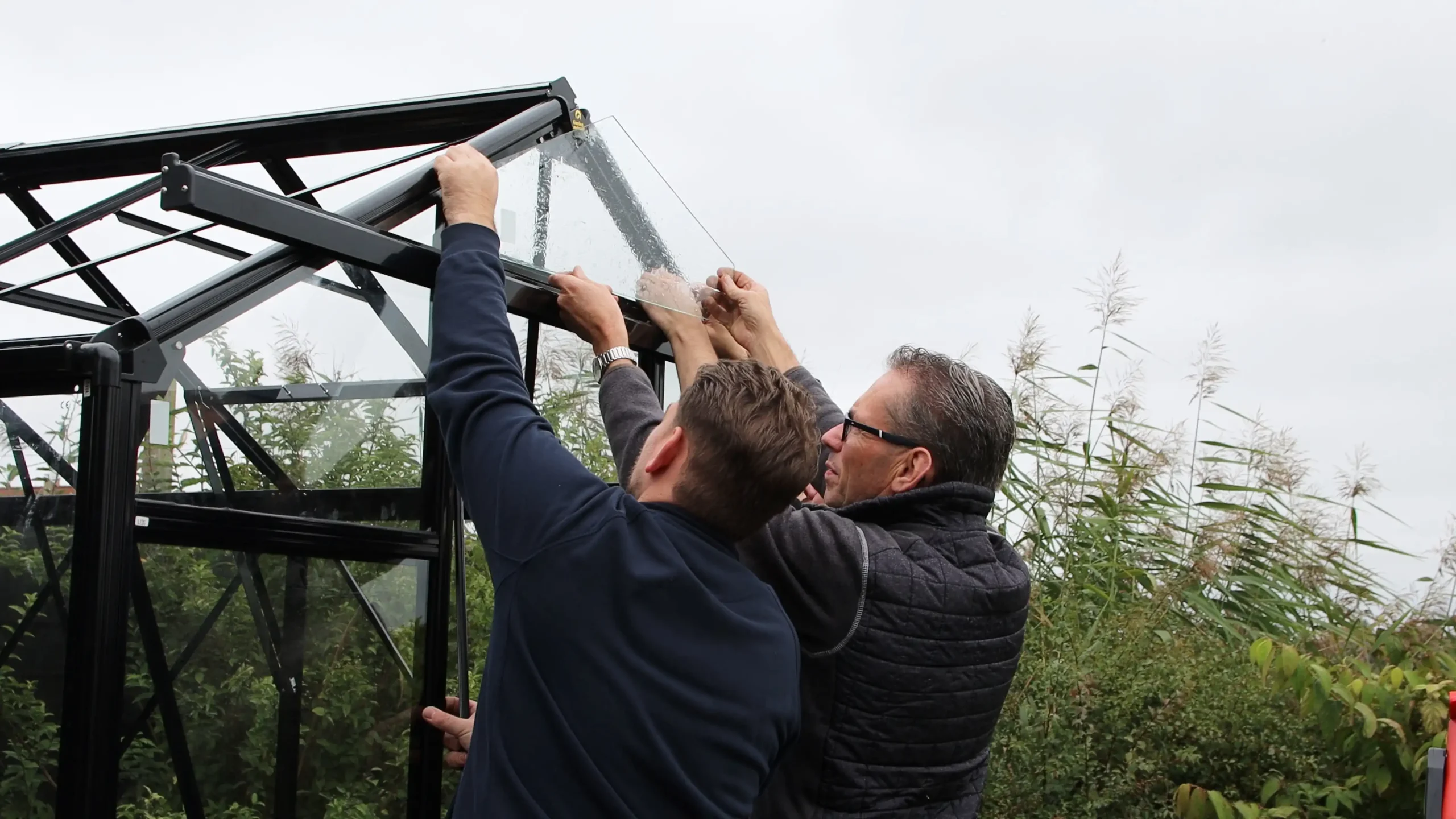 When placing glass or polycarbonate panels, work carefully and avoid putting pressure on the edges. This is where most mistakes happen. For example, a panel can break if it is handled too roughly or if the frame is not perfectly aligned. It is also possible that a panel breaks after installation due to small tensions in the structure. This can happen when the greenhouse settles into place. If that happens, it is usually easy to replace the panel.
