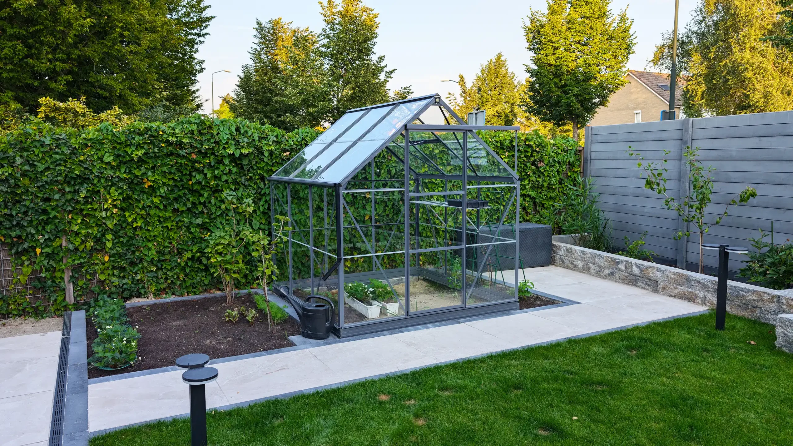 A modern garden is all about clean lines, simplicity and balance. You often see large tiles, neutral colours and a structured layout. A greenhouse or orangery fits perfectly in this type of garden, especially with a black aluminium frame and large glass panels.