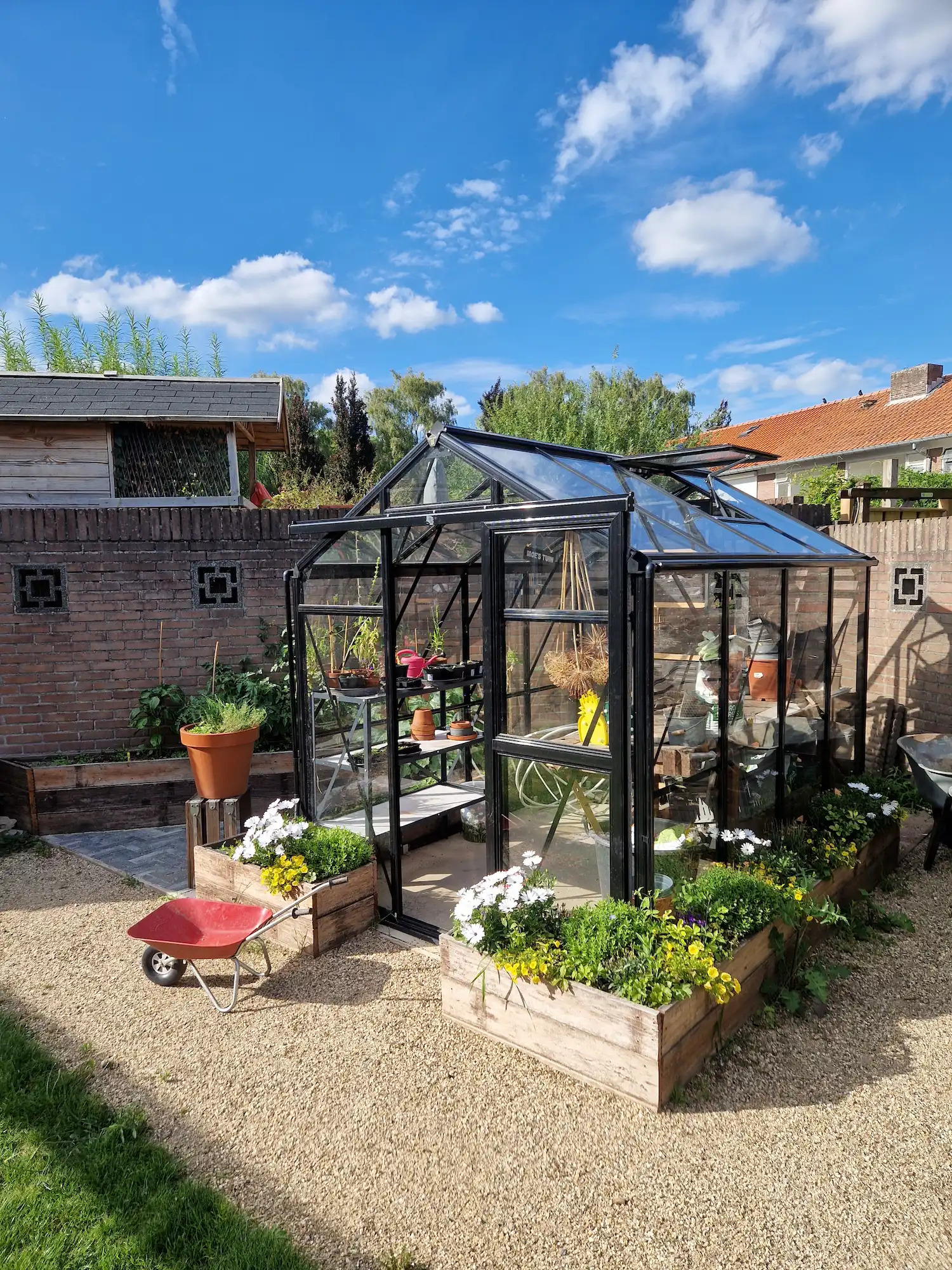 The Four Seasons model is designed for those who want the most out of their greenhouse. With the highest sidewalls and a double sliding door, it offers a more spacious and accessible experience. It also includes additional features like a lockable door and integrated rainwater drainage.